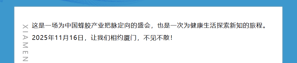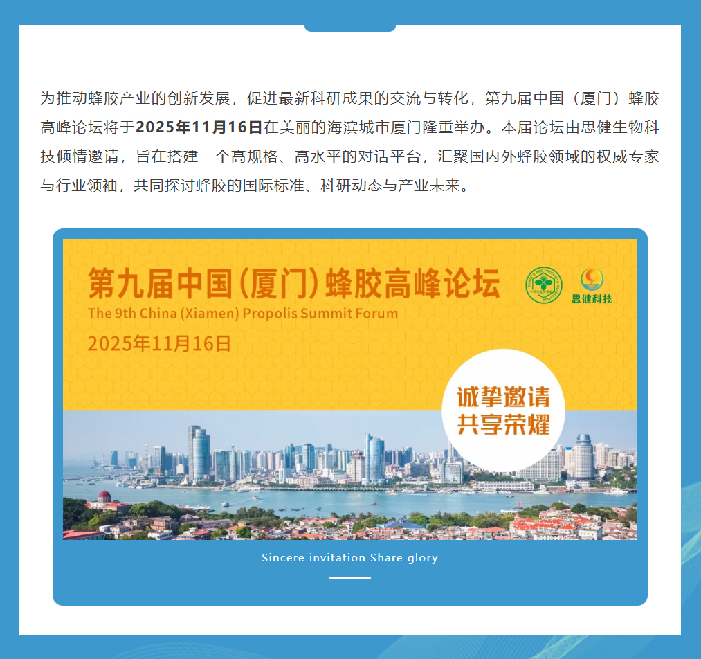 思健生物科技誠(chéng)邀您共赴廈門出席第九屆中國(guó)(廈門)蜂膠高峰論壇:與蜂業(yè)權(quán)威面對(duì)面,洞見蜂膠國(guó)際新未來